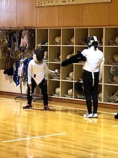 剣道場手前のスペースを使用しているのはフェンシング部です。ウオームアップ後、フェンシング独特の防具を身につけ、剣を手に取り練習を始めました。剣道場の奥では、剣道部が顧問の原田先生に稽古をつけてもらっています。剣道の大きな「気合い」と竹刀のぶつかる音、フェンシングの静かで素早い動きと剣がの金属音、同じ剣を持ってのスポーツですが、これだけ違うのだなと思いました。どちらも、打ち込む時が美しいスポーツだと思いました。新人大会に向けて、がんばってほしいです。