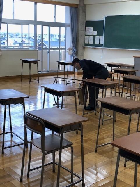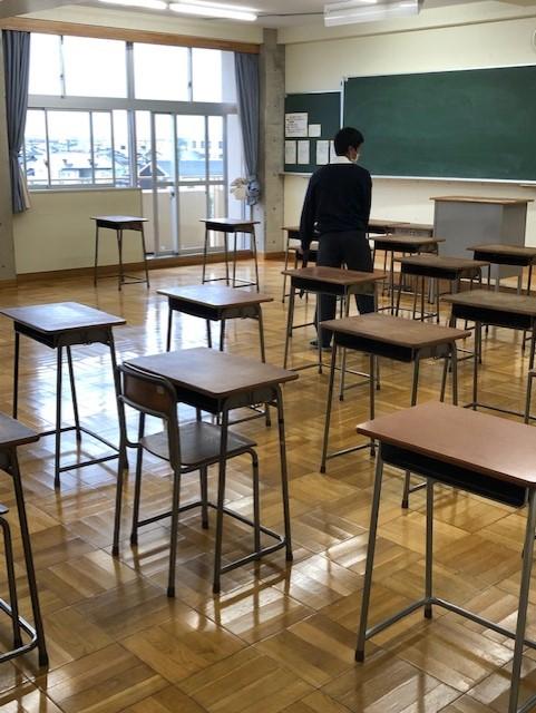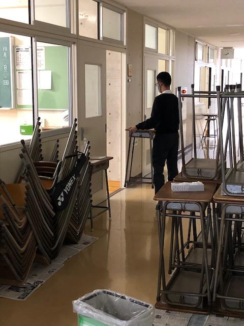 昨日の放課後、3年生の教室のワックスがけが行われています。当然、本日の朝は、教室前の廊下が机やイスで山積みの状態になっていました。このようななか、黙々と友達の机やイスまで運び入れている生徒たちの姿を見ることができました。早い時間に学校に来たのだから、「受験生」なのだから、自分の机・イスをだけを室内に運び入れて、授業の予習などをしていても誰にも責められることがないのかもしれません。しかし、自分たちの貴重な時間を割いて、このような行動をとれる生徒たちが多くいることを本校は本当に誇りに思います。