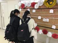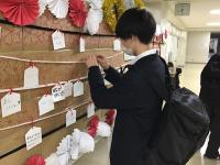 大学入学共通テストまで10日を切った今日、2階の講義室前に受験生応援企画が設営されました。企画したのは、2年生の松本さんと松林さん、2人は「昨年、先輩方が受験生応援企画を行っているのを見て、私たちも3年生のために何かできることがないかと考え、『絵馬』という目に見える形で応援したらいいのではないかと思いつきました。高校生、中学生、先生など、たくさんの人にメッセージを書いてもらい、受験生の励みになったらうれしいです。」と、この企画の動機を語ってくれました。