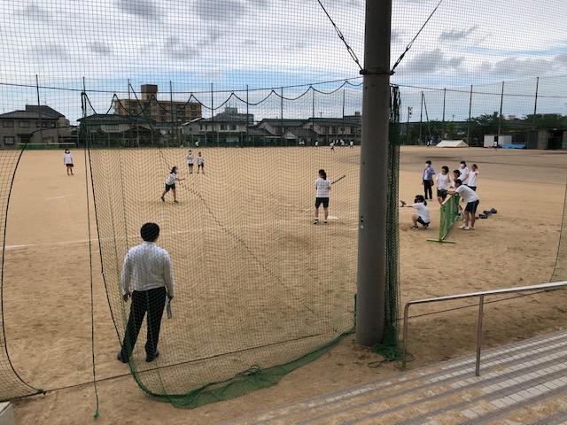 第一体育館の入口には、熱中症予防のための掲示板があります。今日は「警戒~積極的に休息~」レベルでしたが、体育館ではバレーボールを楽しむ男子生徒の姿が、グラウンドではソフトボールに熱中する女子生徒の姿が見られました。