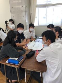 まず、会の発案者である3年生の片岡鈴々さんから、この会の開催を皆に呼びかけた熱い思いなどが参加者に語られ、①議論中、誰に対しても敬語は一切使わないこと ②グループの全員が平等に話し合いに参加できるようお互いに配慮しあうこと ③議論中に「でも」などという他人の意見を否定する言葉は決して使わないこと などの会のルールが共有された後、グループ毎に自由なディスカッションが始まっていきました。3年生のグループリーダーたちが司会を行い、自己紹介、これまでの学びの中での好きな授業とその理由、好ましい授業の共通点を挙げるなどして、生徒と教員の双方が望む授業のやり方についてお互いの考えが深められるよう導いていき、最後に、意見を述べ合った仲間たちとエアハイタッチをして締めくくりました。その後、各グループで出た意見や考えを模造紙に書くことによって全体で共有していきました。参加の生徒にも教員にもたくさんの笑顔が見られ、お互いに良い時間を過ごすことができたのだと確信しています。