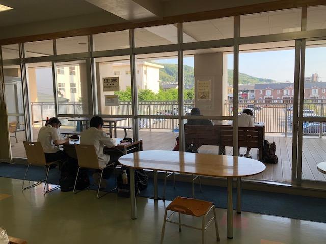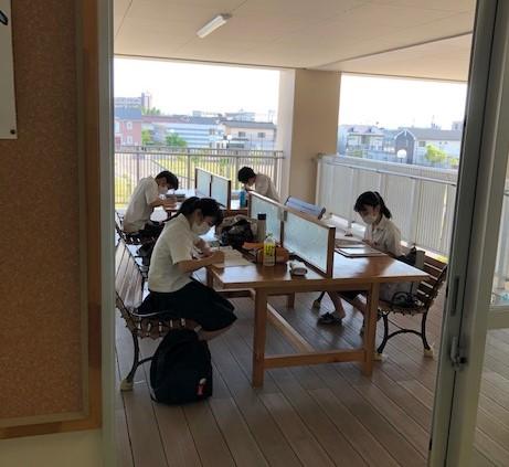 放課後にはいつもと変わらず、校舎のあちこちで自学自習に励む3年生の姿がみられました。この時期、購買のテラス席は気持ちよさそうですね。がんばれ!3年生!みんなで応援しています!