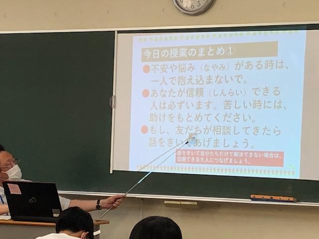 1つ目は「SOSの出し方に関する講習」。悩み事ができたとき、だれに相談すればいいのか、また、相談されたら一体どのように受けたらよいのか、という内容でした。講座はクラス単位で行われ、生徒たちは悩みを打ち明ける役と相談される役に分かれて、それぞれを疑似体験しました。聞くときに大切なのはとにかく耳を傾ける、「傾聴」すること。悩みを打ち明けるのは、SNSなどで出会った「知らない人」ではなく、側にいる友達や大人に相談することが大切だと学びました。隣の人とのロールプレイはとても楽しそうで、友達作りにもなっているならいいなと思いました。