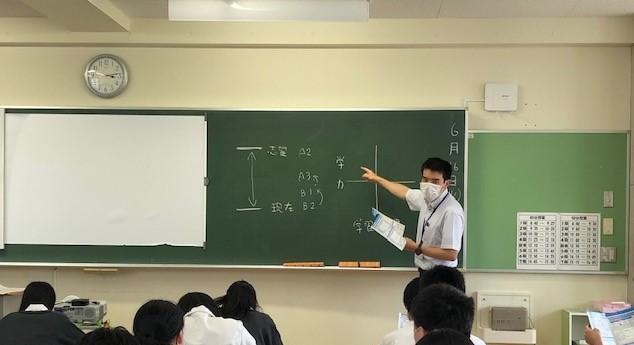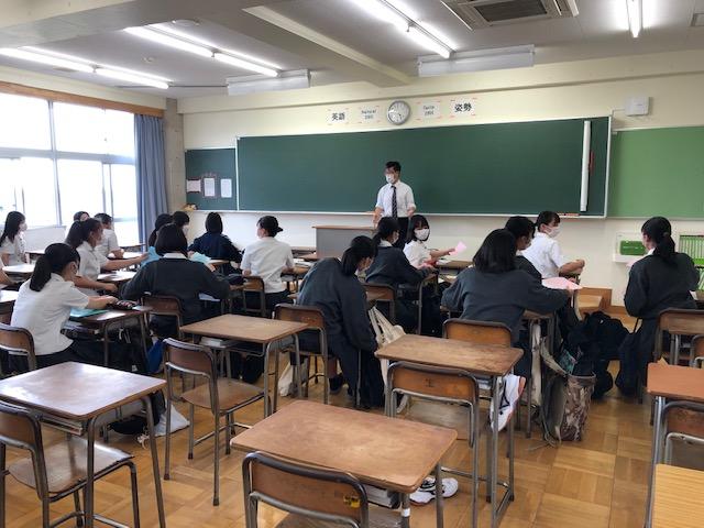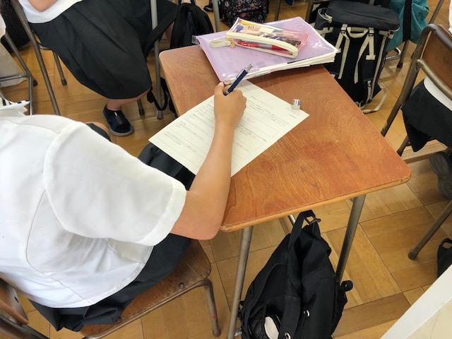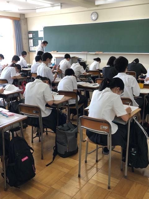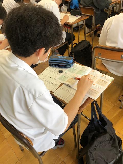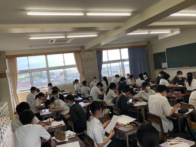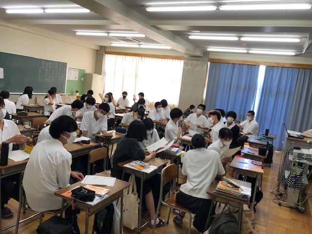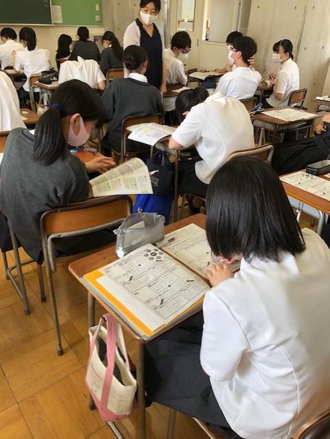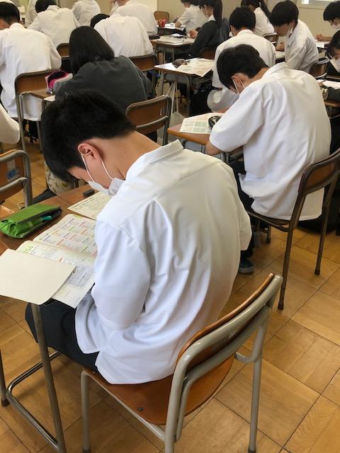 否応がなしに秋には『文理選択』を決定しなくてはならない学年で、例年より2ヶ月遅れの進路学習のスタートとなりましたが、卒業後に自己実現が果たせるよう、自分の将来についてしっかりと考えていってほしいと思います。なお、この時間に完成するワークシートは写真に撮り、これを学習活動の記録(ポートフォリオ)として保存していくことになっています。