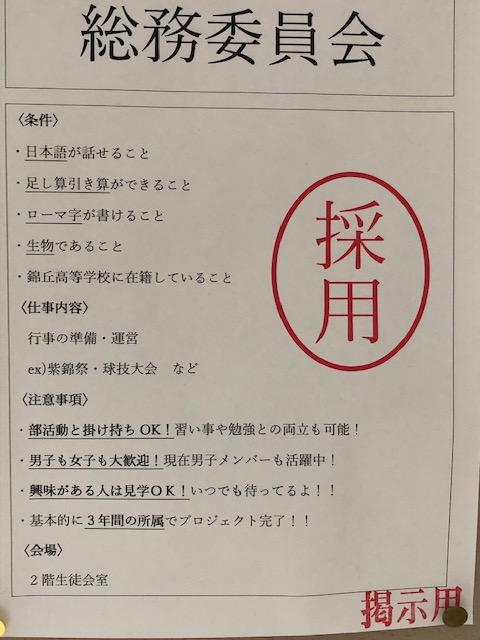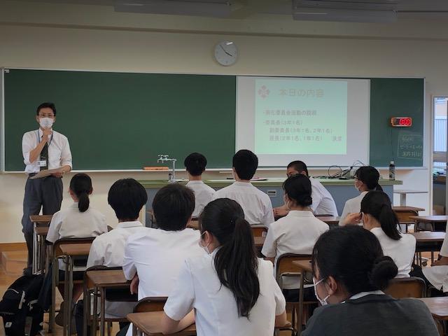 文化委員会では、選出された委員長と副委員長があいさつをし、紫錦祭への意気込みを語っていました。会の終わりには、担当の先生の発案で「一本締め」を全員で行い、生徒みんなが笑顔になっていました。これで(色々な問題があるでしょうが)今年の紫錦祭も大丈夫ですね!