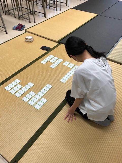 本日の放課後の練習場所(本校2F講義室G)では、机や椅子をどかしてたたみを敷き丁寧に札を並べる練習をするとともに、百人一首を一生懸命に覚えようとしている真剣な顔の同好会員たちの姿をみることができました。目指せ!近江神宮!!