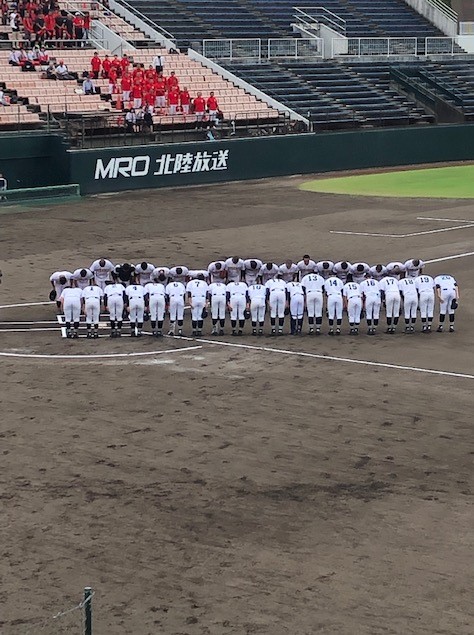 本校野球部は14日(日)に石川県立野球場にて全国高校野球石川県大会の1回戦にのぞみました。相手は金沢龍谷高校で、結果は残念ながら0-9で敗退となってしまいました。試合経過は錦丘打線が序盤からチャンスを多くつくり、応援団席は常に沸いている状態でしたが、3塁まで進んだ走者がなかなかホームに帰ってこられないというもどかしい展開となってしまいました。しかし、選手たちが皆最後まであきらめずに真摯に頑張ってくれる姿をずっと見ることができました。(今後も期待して見てますよ。)