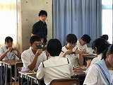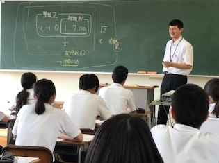 6カ所の実施箇所の1つである「錦丘中学校」では、教員志望の生徒が中学生に数学や英語の授業をしました。英語の授業では4,5人の中学生に一人の高校生がついて、動名詞に関する説明、演習を行いました。生徒たちは緊張しながらも、それぞれわかりやすい授業になるよう精一杯の工夫をしているようでした。将来はきっとよい先生になってくれるものと、我々教員一同は強く期待してますよ。