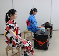 昼食時に茶道部の皆さんが、グループリーダーの留学生6人のためにお茶会を開いてくれました。彼女たちは色とりどりのゆかた姿で美しいお点前を披露し、留学生たちに日本文化の一端を見せることができました。(お茶の飲み方等は当然英語での説明でしたが・・・)