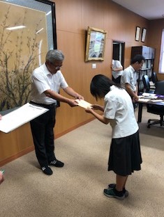 本日校長室にて、短歌マルチメディアチーム(第9回牧水・短歌甲子園に出場)と写真部(第17回民家の甲子園に出場)の生徒たちに激励費が授与されました。また、お知らせするのが遅くなりましたが、7/19に水泳部(北信越大会に出場)、新体操(全国高校総体に出場)、文芸部(全国高校総文祭に出場)、書道部(同)、かるた(同)、JRC部(同)、放送部(全国高校総文祭及びNHK杯全国高校放送コンテストに出場)の生徒たちにも激励費が授与されています。勝負の結果も気になるところですが、大変貴重な機会です。全国の同士たちと是非よい交流の時間を過ごしてきてもらいたいものですね。(精一杯楽しんできてください!)