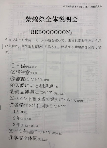 本格的な準備作業は、夏期後期補習と並行して本日(21日(水))から始めていきます。その前に生徒会と総務委員会が主催する説明会がありました。視聴覚室には、各ホームの責任者・副責任者、部・委員会の代表者、自主企画参加者等が集まり、総務委員より準備や発表・催事・模擬店等についての詳細な説明を受けました。夏休み中、総務委員は紫錦祭を成功させるため、暑い生徒会室でさらに熱く話し合いながら計画案を作成してきました。(本当にご苦労様でした。)本番まであと10日。準備も含め紫錦祭を大いに楽しみ、盛り上がっていきましょう!