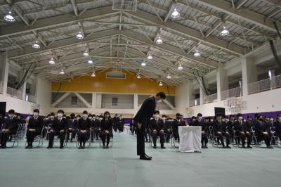 それぞれの場所で大学入試等にチャレンジした仲間たちが久しぶりに教室に集まると、学校は笑顔と明るい声でいっぱいになりました。本日の式典には、例年であれば、卒業式に列席する2年生も参加して行われますが、今年は送辞を読む代表生徒一人のみが参加しました。