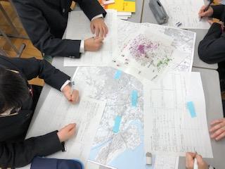テーマは「金沢」。金沢の町をいろいろな視点から分析し、最後にその情報を統合して、考察するという内容です。人口分布はどうなっているか、学校はどこにあるか、地形の特徴は何か、など、机の上いっぱいに広げられた金沢の地図の上に、様々な統計資料を重ね、グループのメンバーと議論します。どうしたら問題を解決できるか、どうしたらよりよい町に変えられるのか、生徒たちは大変活発に意見を出し合っていました。