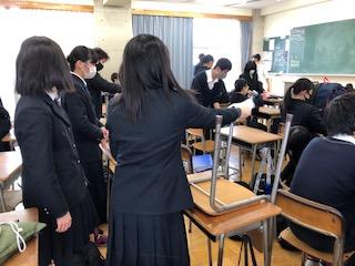 下の写真は7:30頃の2年生の教室の様子です。教室が受検会場となっていたため、早くに登校した生徒たちが自主的に教室の復元作業を行っていました。特に、2年生たちは手慣れた様子で、先生方の指示がなくても、不足している机やイスの数を元に戻しきちんと並べ、ホワイトボードなどの不要物は所定の位置に戻し、室内の掲示物の復元まで行ってくれていました。