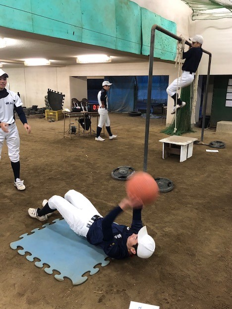 雨などのためグラウンドの使えない日は、限られた場所での工夫した練習が必要となります。体育館(第一フロア)下には、土を敷いた雨天練習用のスペースがあり、野球部の皆さんが重たいボールやダンベルを使ったトレーニング、器具を使った懸垂や背筋などのトレーニングをしている姿が見られました。ポップな?音楽がかけられたなか、様々なメニューをリズムよく次々と行っていく彼らの姿に、しばらくの間見入ってしまいました。今週は天気の悪い日が多いのですが、早く春になって、グラウンドで思い切り硬式球を使った練習ができるようになるといいですね。