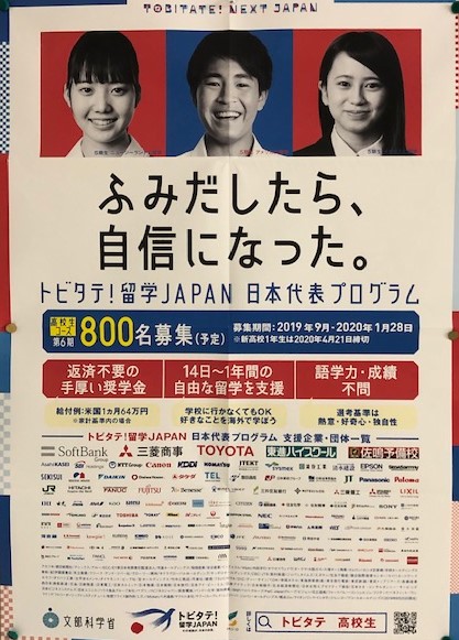 中央階段踊り場の掲示板に、”トビタテ!留学JAPAN(文部科学省)”などの海外留学プログラムの募集に関するポスターが掲示されています。本校では、この夏に2年生の4名が海外短期留学に出かけています。(トビタテで3名、いしかわ少年の翼で1名でした。チャレンジを考える人は今から準備が必要です。)