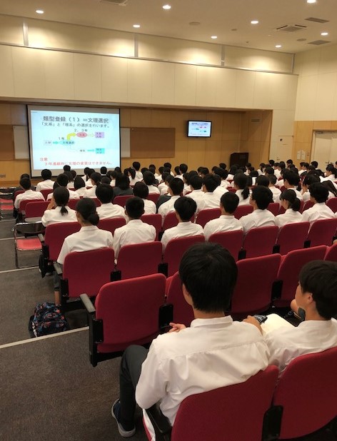 本日、1年生を対象にして“類型登録説明会”が実施されました。まず、教務課と進路指導課より全般的な文理・科目選択についての説明やアドバイスがありました。続いて、1年の地歴公民担当、および理科担当のそれぞれの教員より教科(科目)の特性を踏まえた選択に向けた説明やアドバイスがありました。生徒たちは、自分自身の人生を切り開くべく真剣なまなざしでそれぞれの説明に耳を傾けていました。我々教員は、生徒たちがこの夏休みにこれまでの自分やこれからの自分ととことん向き合い、人生の選択に本気で取り組んでくれることを強く願っています。ご家庭でも是非アドバイスをよろしくお願いいたします。