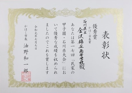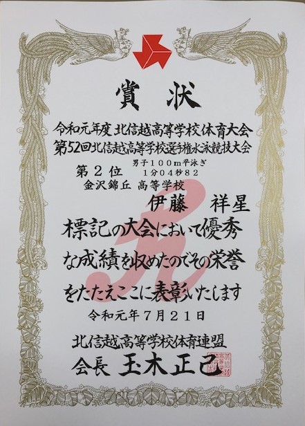 北信越大会へ出場していた水泳部から嬉しいお知らせが届きました。個人男子100m平泳ぎに出場した32H伊藤祥星くんが見事第2位となり、インターハイの出場切符を獲得しました。また、写真部が写真の出来映えとその写真についてのプレゼンテーションを競う「民家の甲子園・石川県大会」において河北市長賞(優秀賞)を受賞するとともに、28H石川音杏さんが最優秀個人賞を受賞されました。両部とも本当におめでとうございます。8月に行われる全国大会でも、ぜひベストを尽くしてきてください!