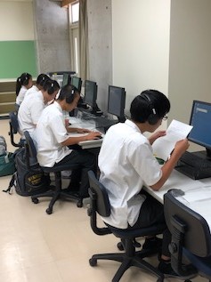 下の写真は、ある英語の試験を受けている生徒たちの姿です。(鉛筆は持っていません。ヘッドホン・マイクとキーボードを使っています。)現2年生より大学入試共通テストで”英語の民間検定試験”が活用されることとなっています。また、大学入学後には文理を問わず、TOEFLやTOEIC等の英語運用力試験の受験や留学を強く推奨するところが大変多くなってきています。一昔前の英語はペーパー上で「読むこと」「書くこと」ができれば良かったのですが、現在では「聞くこと」「話すこと」が同様に重視されています。また、「書くこと」については”タイピング”の技術が必要となるものがあったり(すべての試験がそうなっているわけではありません。)、実際の”スピーキング”力をきちんと評価してくれる試験(自分の英語を録音して採点してもらう)も行われたりするようになっております。