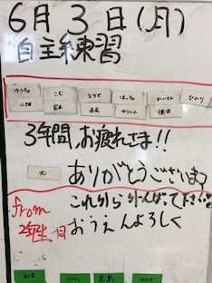総体・総文期間が終わり、「学習へのきりかえ」・「大きな夢の実現方法」などの話が中心でした。先生方の激励に耳を傾ける3年生の姿勢・眼差しから、これからの学習などに対する意気込みを強く感じました。「錦丘3年丸」という一隻の船に乗る仲間であることの「素晴らしさ」と「心強さ」も再確認できました。