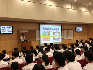 次に、金沢中警察署生活安全課の小野寺啓氏から、薬物乱用の危険性について話していただきました。交友関係の広がりとともに自分でも知らないうちに薬物と関わる危険性が増えてきているという現状を、生徒たちは決して他人事とは考えず、自分にとって身近な問題としてとらえている様子がうかがえました。
