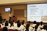外交官を志望するきっかけや赴任地、外交交渉、首脳間の通訳などご自分の経験からわかりやすく話されました。生徒からの質問で「仕事上、女性であることが不利と感じたことは何か」に対し、「外務省は比較的女性が多い職場で仕事がしやすい。出産育児などで仕事ができないことはあるが、女性しかできないこと」と、物事を前向きにとらえている姿勢が印象的でした。