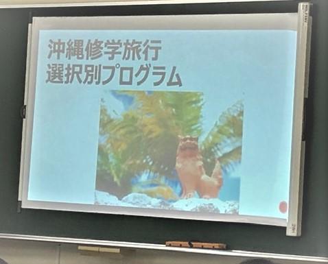 本日の7限目、2年生の教室ではきれいな色合いのパワポが目立ちました。内容は沖縄修学旅行。今日は一人一人が選べる沖縄での活動の紹介でした。自然体験コース、文化体験コース、世界遺産コースと分かれ、生徒たちはキラキラした目で、食い入るように画面を見つめ、先生の話を聞いていました。コロナ禍ではありますが、このような生徒の姿を見ていると「行かせてあげたいな~」と思います。想いが強ければ願いは叶う!? みんなの想いで、一生の思い出を手に入れよう!!