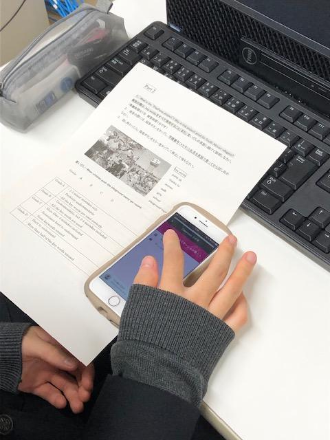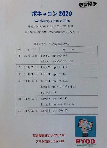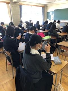 1年生の毎週金曜日の朝学習(8:15~)の時間帯は「ボキャブラリーコンテスト」になります。三藤副校長先生がつくられた25題程度の英語の問題をスマホ等を用いて回答していきます。(スマホを持たない生徒のために紙でのテストも用意しております。また、本校では教室内でスマホ使用の授業を行うときは、入り口に看板が掲示されます。)本日朝も真剣な面持ちでテストにむかいあう生徒たちの姿をみることができました。さて、今回のテストの学年平均点は、21点(25点満点)になるそうです。日頃からの努力が「なりたい自分」を達成するために必要な大きな武器をつくってくれるのではないでしょうか。