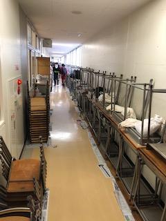 教室の中の全ての机、椅子、棚を廊下に出して、すみずみまできれいに掃きます。