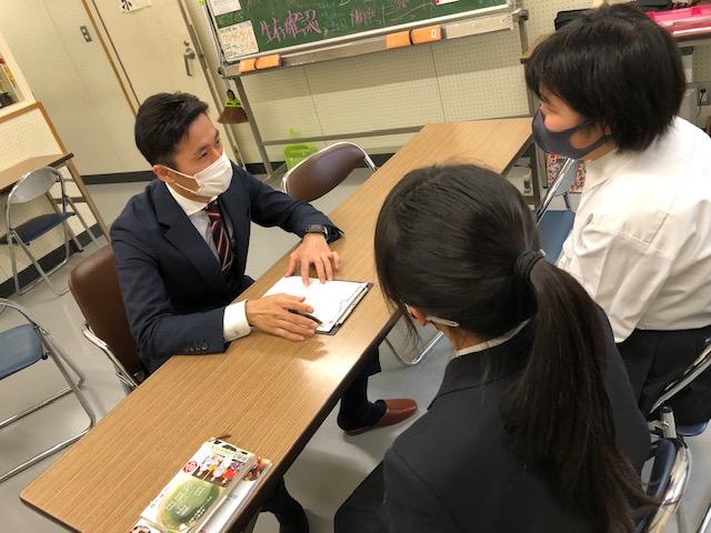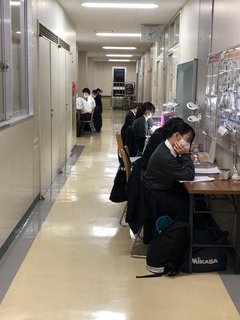 学校の廊下も、放課後は特に寒くなってきましたが、寒くても3年生は廊下で勉強をします。膝掛けを足に巻き付けるようにして勉強する生徒もいます。「なんでわざわざ寒い所でやるの?」と聞くと「寒いと集中できます」という答えが返って来ました。受験生たちは時間を最大限に活かすために様々な工夫をして、目標に向けて毎日がんばっています。進路室周辺の廊下の自習スペースはいつも生徒でいっぱいですが、進路室の中では質問をする生徒と答える先生の熱気でいっぱいです。