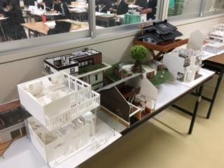 先日ご紹介した1年生の美術の課題である”建築物の模型”が、現在中央階段2Fの踊り場に展示されています。題して「建築作品を作る」。