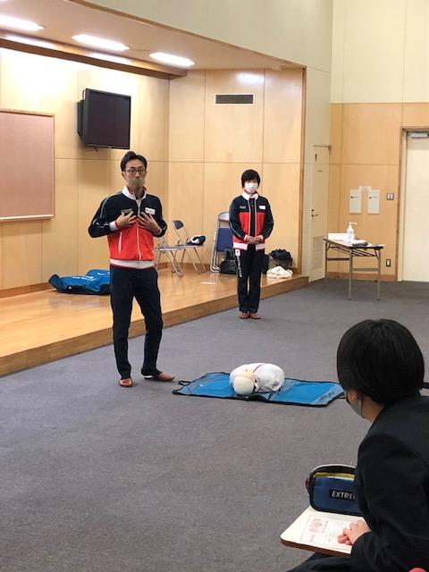 講習は、なぜ救急法を多くの人が知らないといけないのか、実際に倒れている人がいた場合はどのように対処すべきなのか、AEDはどのように使用するのかといった具体的な内容でした。意識や呼吸の有無を確認し、無しと判断したら勇気をもって心肺蘇生法を施すこと、他の人に助けを求めることが大切なことなどが話されました。最後に、代表生徒が実際に心肺蘇生法に挑戦し、AEDを実際に使ってみるなどすると、生徒たちは真剣にその様子を見て学習していました。