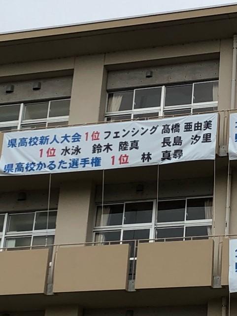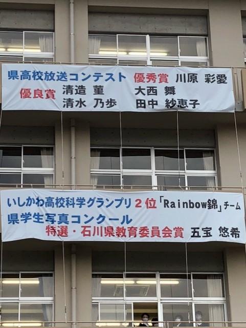 秋の文化部大会等や運動部の新人大会で顕著な成績を収めることができた部・同好会の横断幕が校舎に取り付けられました。競技かるた同好会、文芸部、放送部、写真部、いしかわ高校科学グランプリ参加有志、水泳部、フェンシング部、少林寺拳法部、弓道部、サッカー部の成績および入賞者の氏名が記載されております。(よく頑張りましたね!)