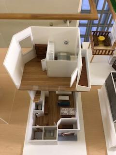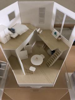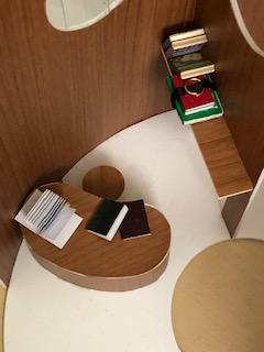 先日、中央階段に1年生美術選択者の建築作品で「街」ができましたとお伝えしました。外観にこだわった素敵な模型が多いのですが、なかには製作に時間がかかったであろうと思われる細かい内装まで描かれたものも見られます。今日は、その素敵なミニチュアの世界をご紹介します。ときどき足を止めてじっと家の中を覗いている生徒もいて、その愛らしい世界に魅せられているのは筆者だけではないようです。