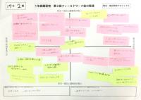 学校に戻ってからは、それぞれの部屋で整理会を行い、机の上に広げられたシートに自分たちの気づきを書き込んだ付箋を貼り、本日の活動の成果を分析し、記録していました。