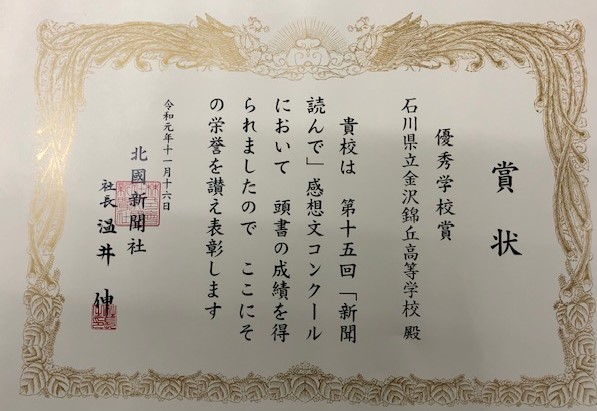 11月18日(土)に”「新聞読んで」感想文コンクール(北國新聞社主催)”の表彰式が行われ、13H矢木陽さん、16H吉村奈那子さん、26H針谷夏月さん、27H岡谷葉優さんの4作品が佳作に入賞するとともに、本校が優秀学校賞を受賞しました。生徒の皆さん、本当におめでとうございます。