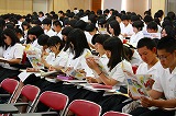 「ケータイ安全教室」は株式会社NTTドコモ北陸支社の方により、架空請求詐欺、なりすまし、個人情報の取り扱い、誹謗中傷・犯行予告などの内容でした。それぞれの内容についてフィクションのドラマがあり、生徒たちにとっては強く印象に残る映像でした。