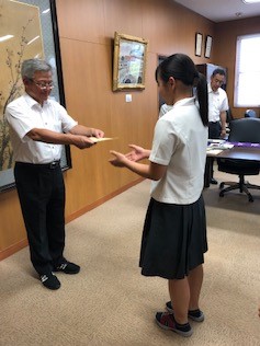 本日校長室にて、短歌マルチメディアチーム(第9回牧水・短歌甲子園に出場)と写真部(第17回民家の甲子園に出場)の生徒たちに激励費が授与されました。また、お知らせするのが遅くなりましたが、7/19に水泳部(北信越大会に出場)、新体操(全国高校総体に出場)、文芸部(全国高校総文祭に出場)、書道部(同)、かるた(同)、JRC部(同)、放送部(全国高校総文祭及びNHK杯全国高校放送コンテストに出場)の生徒たちにも激励費が授与されています。勝負の結果も気になるところですが、大変貴重な機会です。全国の同士たちと是非よい交流の時間を過ごしてきてもらいたいものですね。(精一杯楽しんできてください!)