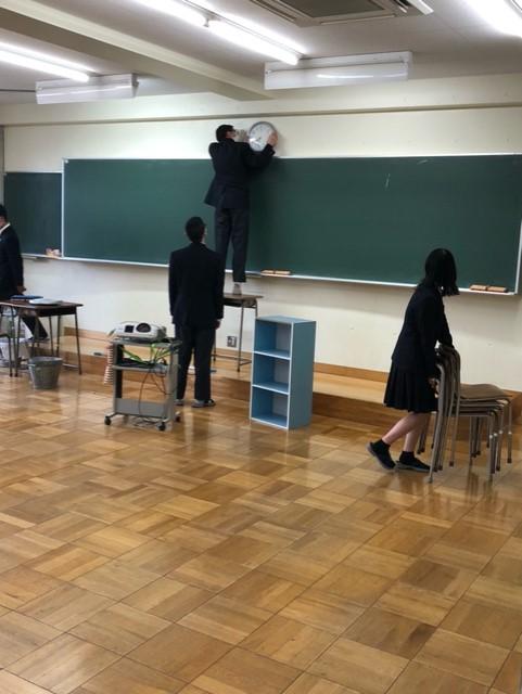 下の写真は7:30頃の2年生の教室の様子です。教室が受検会場となっていたため、早くに登校した生徒たちが自主的に教室の復元作業を行っていました。特に、2年生たちは手慣れた様子で、先生方の指示がなくても、不足している机やイスの数を元に戻しきちんと並べ、ホワイトボードなどの不要物は所定の位置に戻し、室内の掲示物の復元まで行ってくれていました。