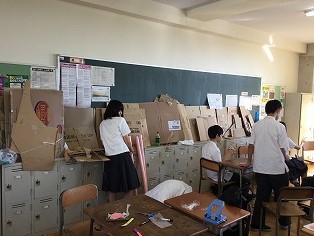 26H(担任:村上先生、男子13名・女子29名)は「ぴんくのきもち」という縁日の準備で忙しい毎日です。縁日ではヨーヨー釣り、射的、気配切り、運命の人探しをする予定で、生徒全員で協力してやっています。かわいいピンクの雰囲気の縁日をぜひ楽しんで下さいね。お待ちしてまーす!