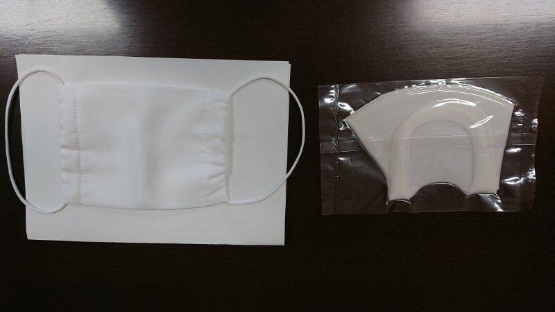 (左がいわゆる「アベノマスク」、右が使用前のウレタン生地のマスク)