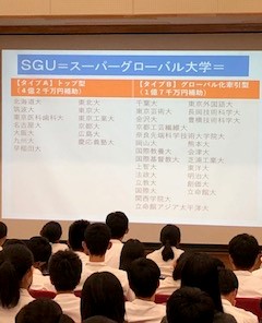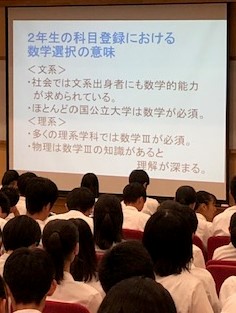 本日、2年生に「科目選択説明会」が実施されました。まず、新谷教務課長より文系・理系別に科目登録を行う際の注意点(特に苦手科目から逃げるような選択はしないように!)が説明され、続いて沖野進路指導主事より”文理問わず社会で論理的思考力が求められており、また進路選択の面でも大きく狭まってしまうため、数学をできるだけ選択してみてはどうか”や”偏差値だけで大学を選ぶのではなく、入学してからの学びを考えてSGU(スーパーグローバル大学)に指定されている大学なども志望してみてはどうか”などの提案がありました。最後に、小原数学科主任より、数学の具体的な頑張り方などのレクチャーが行われました。10月4日が登録の最終期限となります。