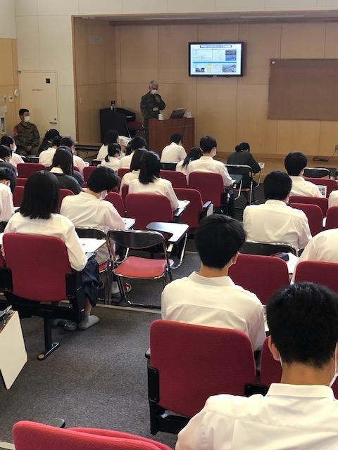 本日の1年生の6,7限目は課題探究の時間となり、陸上自衛隊の方を招いて、防災・減災の具体策を考えるために必要な知識・事例等について学びました。生徒たちは、2クラス交代で視聴覚室に集まり、陸上自衛隊が近年対応してきた様々な災害現場の写真を見ながら、防災・減災について学んでいきました。災害現場の大変さや隊員の方々の活動・活躍に緊張感や敬意を感じながら、ときおり、現場に出られた自衛隊員の方の生の「心の声」なども紹介されることもあり、非日常におかれた人間心理等も学べる有意義な時間となりました。今後、「防災・減災プロジェクト」に取り組むグループの生徒たちは今回の学びを活かした研究を進めていくことになります。また、「商店街活性化プロジェクト」に取り組むグループの生徒たちには、自身の防災意識を高める良い機会としてほしいと願っています。