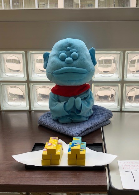 本日から、錦丘中学校の入学願書の受付(~17日金)が始まっております。また、センター試験を今週末にひかえていることもあり、学校の事務室や3年生教室付近には緊張感が漂ってきています。このようななか、3年生の守護神”はまだ大明神”は、いつの間にか座布団の上に座り、またお供え物までされていました。(はてさて、誰がしたのでしょうか??先週にはなかったような・・・)「苦しいときの神頼み」とはよく言われておりますが、3年生たちが不安や緊張感で平常心を失わないように、私も何かお供えしておこうかと、つい思ってしまいました。