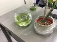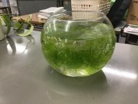 緑の藻に隠れているメダカを探しているだけで心が和みます。職員室のメダカ、癒やしのスポットです。