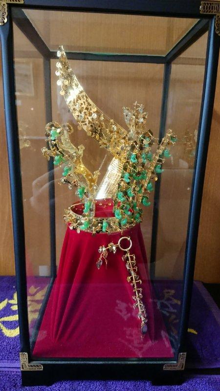 校長席から見て左手にこの冠が鎮座しています。韓国国宝の天馬塚(古墳)金冠のレプリカです。2005年6月10日(金)韓国ソウル市の文化高校にて、錦丘高校との親善交流会の成功を記念し、当時の第15代錦丘高校長村井加代子氏(石川県初の女性高校長)に贈呈されたものです。錦丘として初の海外修学旅行でした。堀も前年の韓国視察から関わり、副団長として400名の生徒引率団の一員としての任務を全うしました。双方400名ずつの壮大な交流会は、当初、大人たちが恐れていた反日感情やら、差別的発言・態度やらの欠片もありませんでした。英語(とジェスチャー)を駆使し、自己紹介し合い、プレゼント交換し、校舎のあちらこちらで笑顔と歓声が炸裂。あの光景は今でも脳裏に焼き付いています。異文化の人たちとの出会いは、その後の対人コミュニケーション能力育成に大きな影響を与えます。時間の長短ではありません。経験の有無が肝要なのです。堀は過去に、海外修学旅行引率4回、アメリカ本土へ1ヶ月余のホームステイ引率3回(おまけに、知事の北欧<フィンランド>教育視察・企画実施1回も)等経験し、交流時間の長短に関わらず、未来指向で感動的な交流会やら、ハグし涙で別れを惜しむ生徒の姿やらを、無数に目の当たりにしてきました。あの経験はお金では買えない、まさにpricelessだと思います。