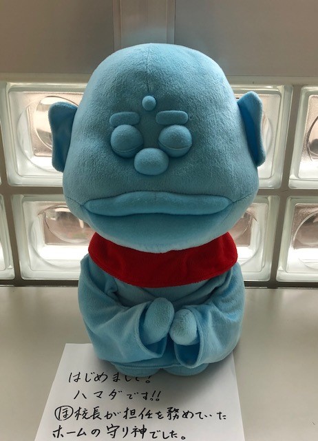 3年生教室棟の廊下の一画に、不思議なお地蔵さん??が現れました。実はこれ、堀学校長が3年ホーム担任をされていたときに教室に置いていた守護神なのだそうです。このときの受験結果がけっこう良かったそうで、今回、本校にもお持ちになりました。
