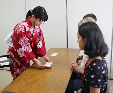 本校茶道部は、週に1回外部の方にご指導をいただいています。本校の校舎には、茶道室があり、お茶の入れ方などを本格的に学ぶことができます。また、毎回美味しい和菓子も食べることができます。美味しい和菓子と温かいお茶に心が癒やされます!(↓エンパワーメントプログラムの留学生にもお点前をご披露しました。)