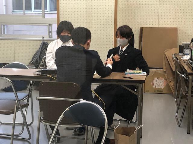 本日、MROのアナウンサーである石橋弘崇氏が来校されて、本校の放送部2名に取材活動をされました。放送室に入っていくと、ガラス越しの奥のスタジオに、21H清水乃歩さん(放送部部長)と28H野上木乃香さんとの3人が打ち合わせを行っていました。数分のうちに早くも収録開始。ラジオなので音声のみですが、大きめのレコーダーと大きなマイク(テレビなどで見るようなフワフワカバー?のついたようなもの)が用意されました。ガラス越しにマイクが動き、楽しそうに笑ったり、真剣な顔つきになる生徒の様子が見られました。