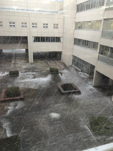 今日は荒れ模様の1日でした。青空が広がったと思うと、俄に灰色の雲が空を覆い、強い風がビュービューという音をたてて吹き出し、最後には氷の粒のような雪がたたきつけるように降ってきました。ちょうどその時に、3年生の下校時間となり、生徒たちは前屈みになって、傘もさせずに足早に帰っていきました。強い低気圧が通過した際のこのような気象変化が「教科書に書いてあるとおりだ!」と職員室の理科の先生方が感心して話していました。